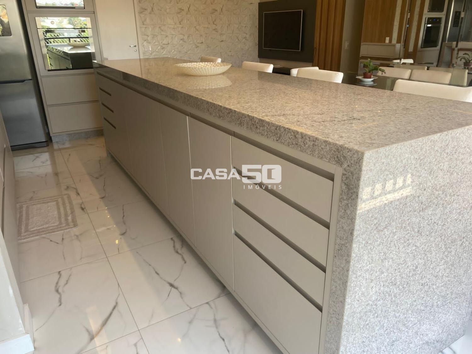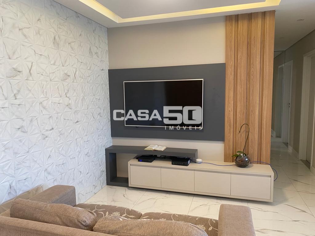Sala ampla e integrada: A sala de estar e TV conecta-se harmoniosamente à sala de jantar e à elegante varanda gourmet com churrasqueira, perfeita para receber amigos ou relaxar com a família.