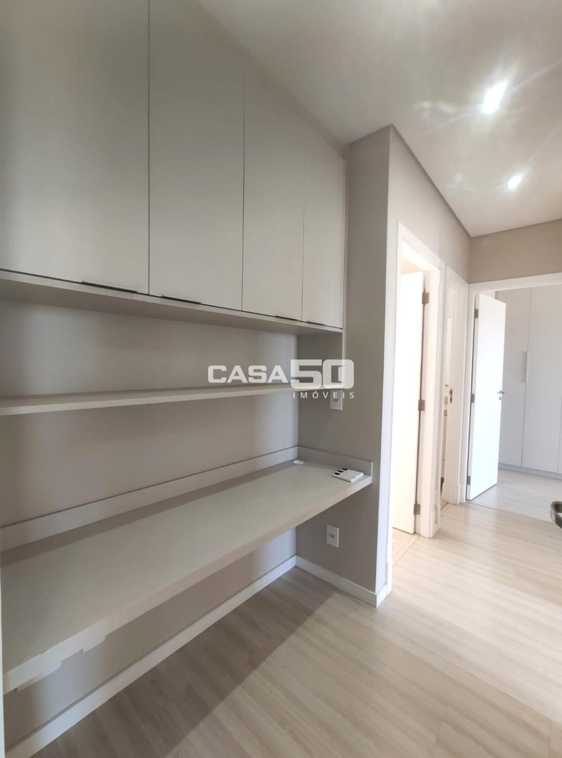 Corredor com mini office planejado para estudar e trabalhar confortável, dentro do seu lar.