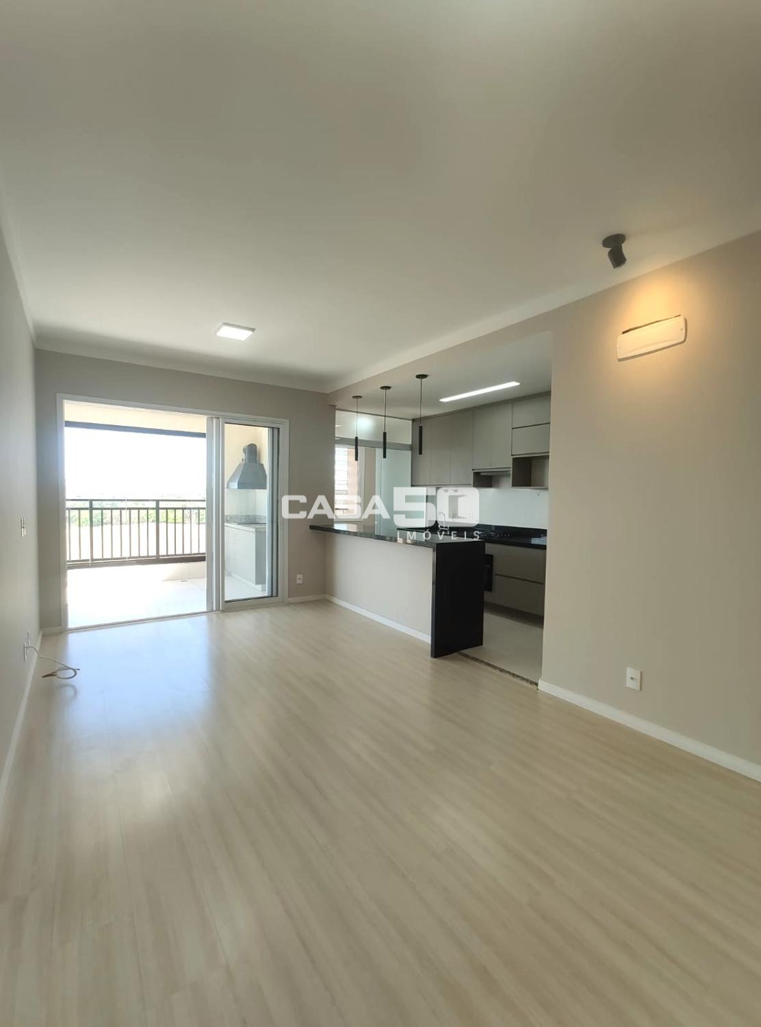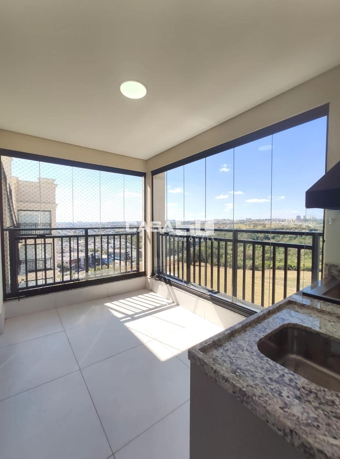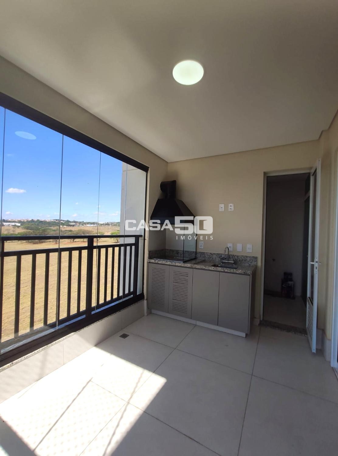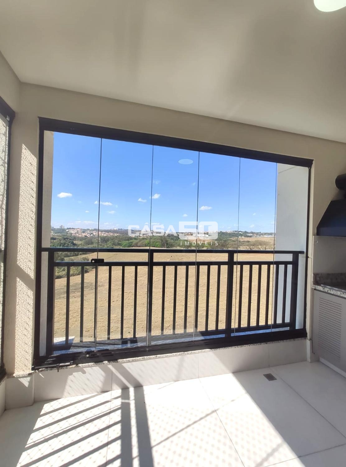 Ampla sala integrada à varanda gourmet, com churrasqueira, vista maravilhosa para natureza e sol da manhã.