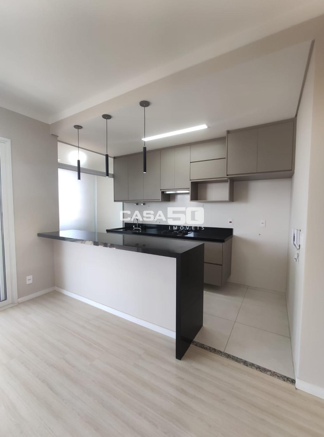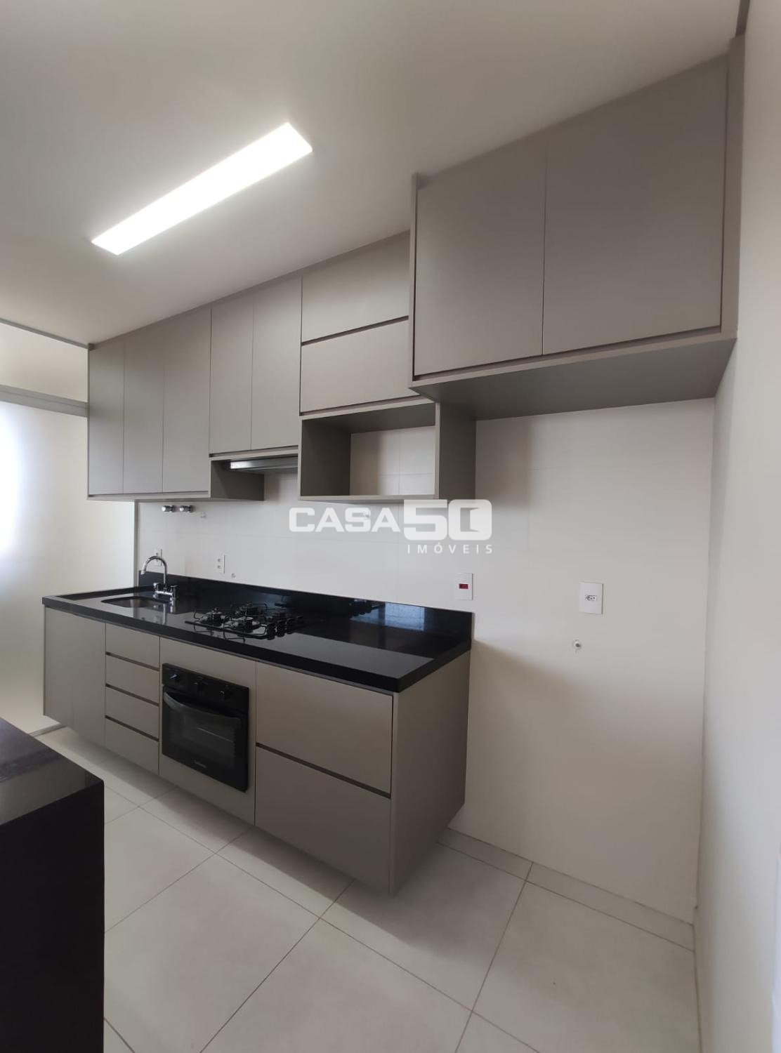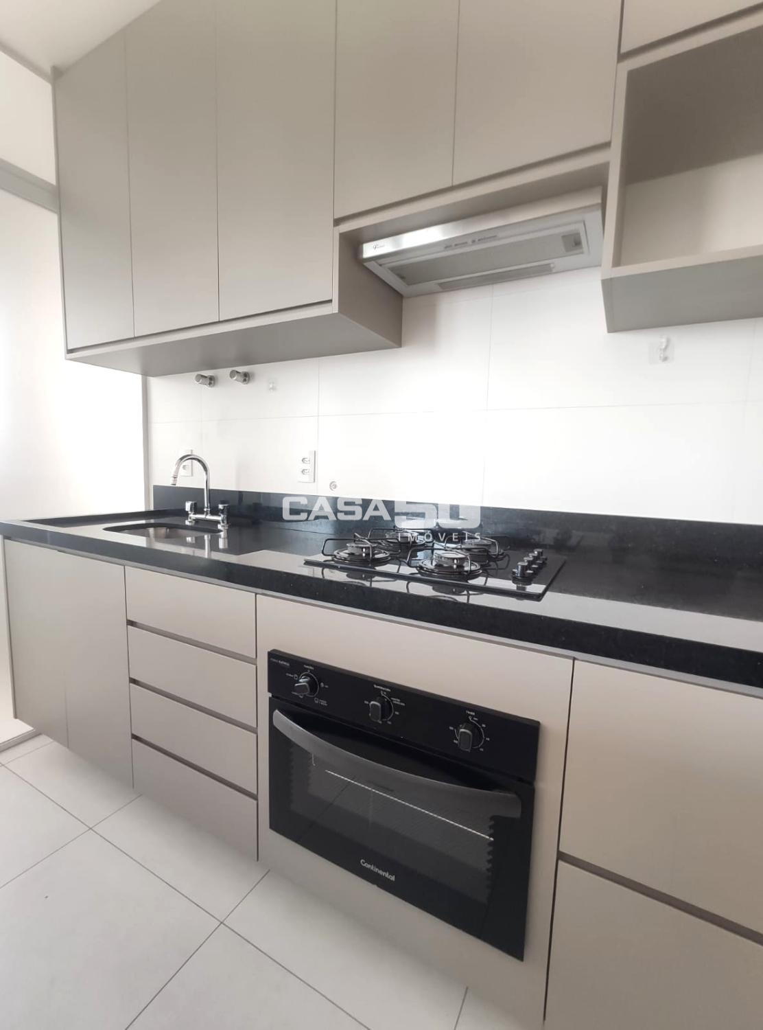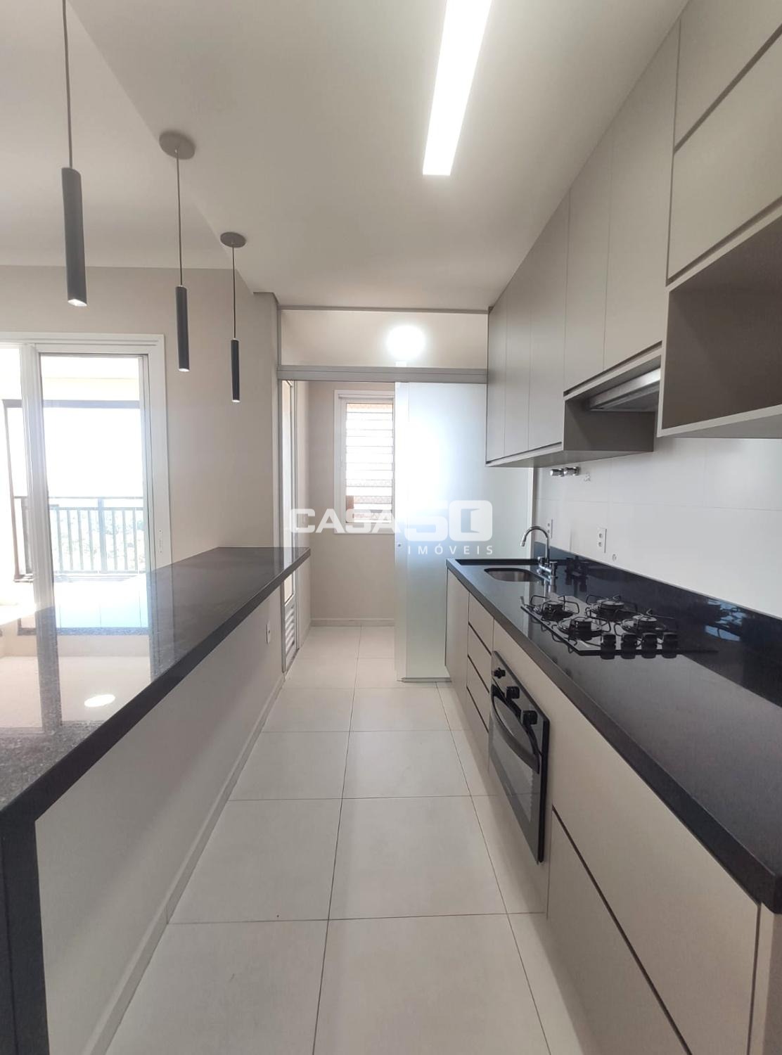 Cozinha planejada, com cooktop, forno e depurador. Lavanderia separada, com porta de correr, divisória de vidro.