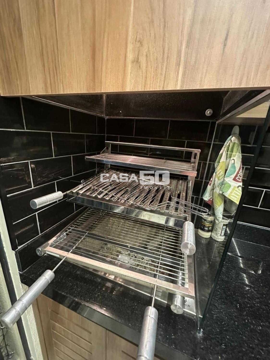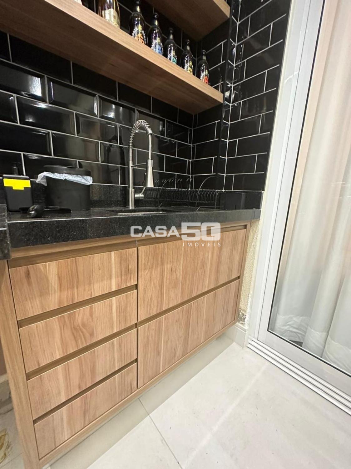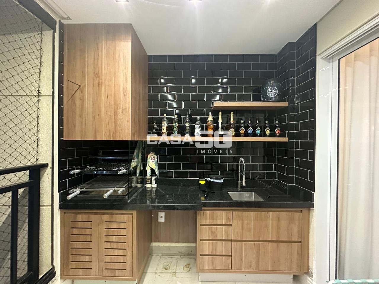 Uma varanda gourmet aconchegante, com churrasqueira e pia de apoio.