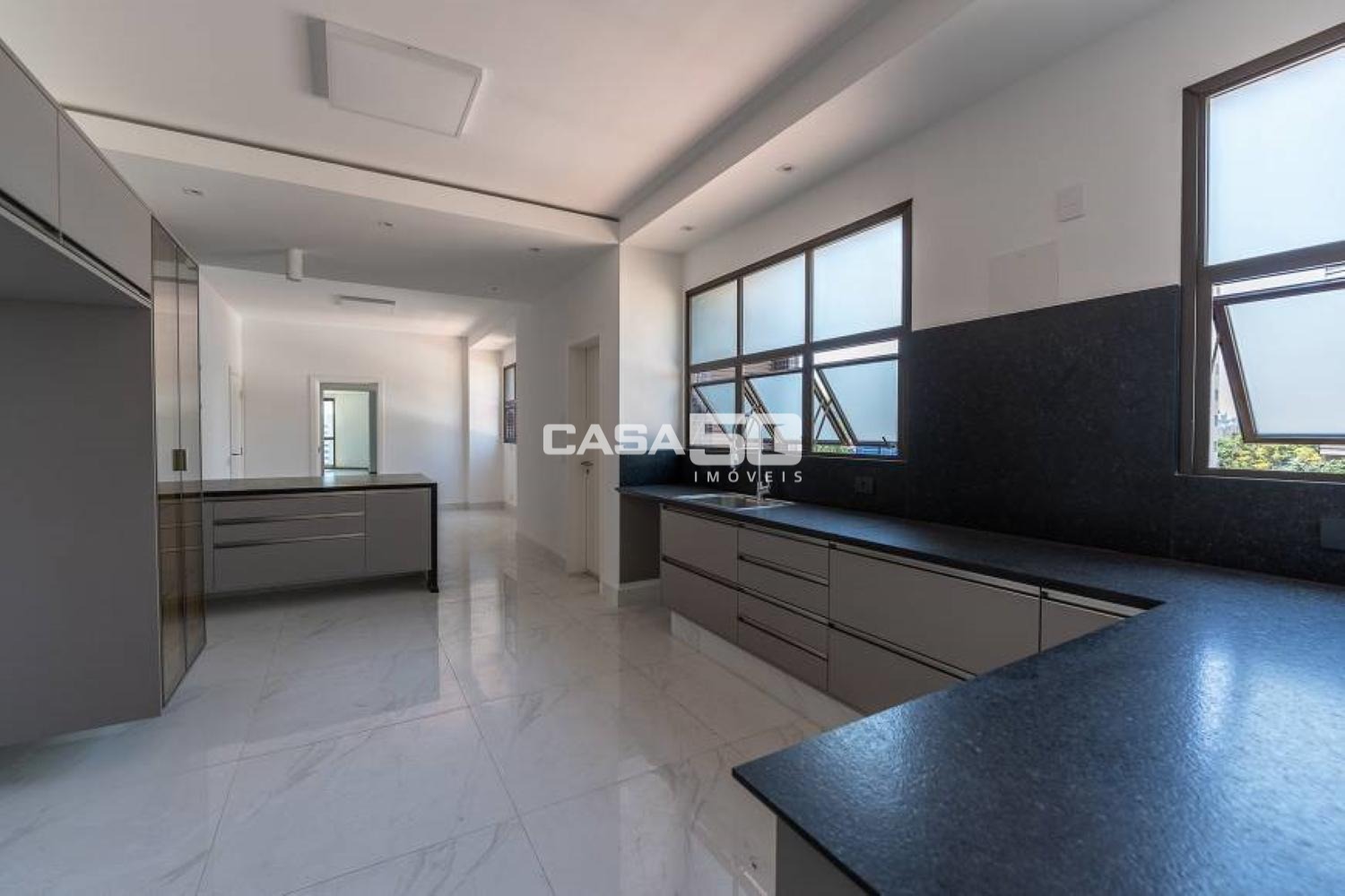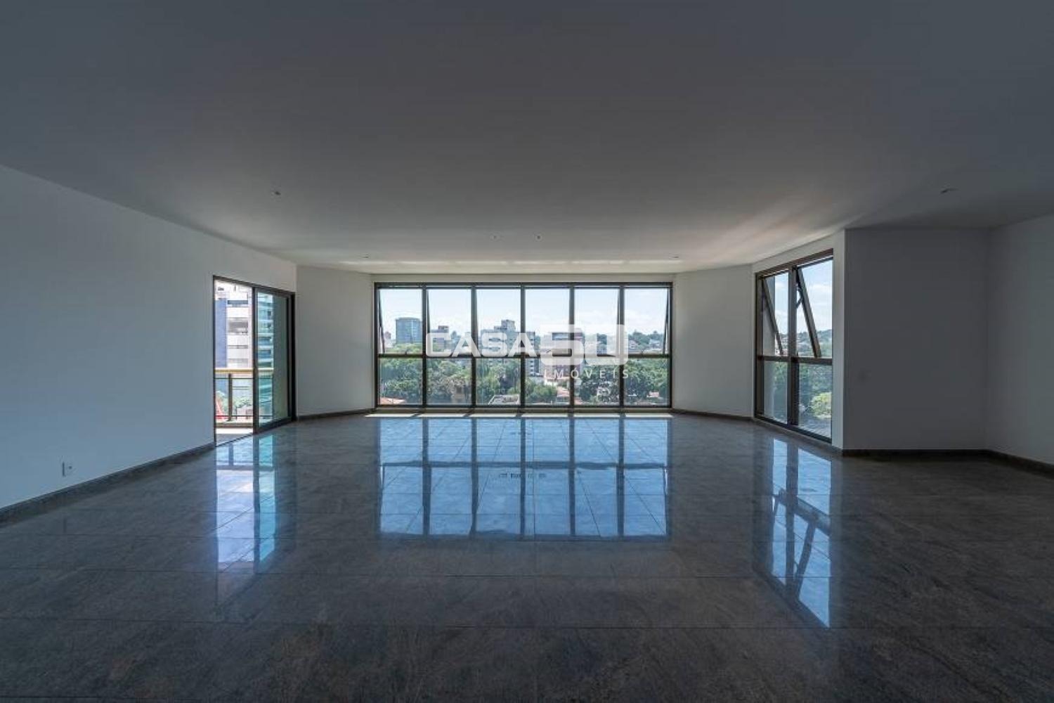 Piso em granito nas salas de estar, jantar, sala de TV, Hall de entrada social, Hall de serviço e varandas.