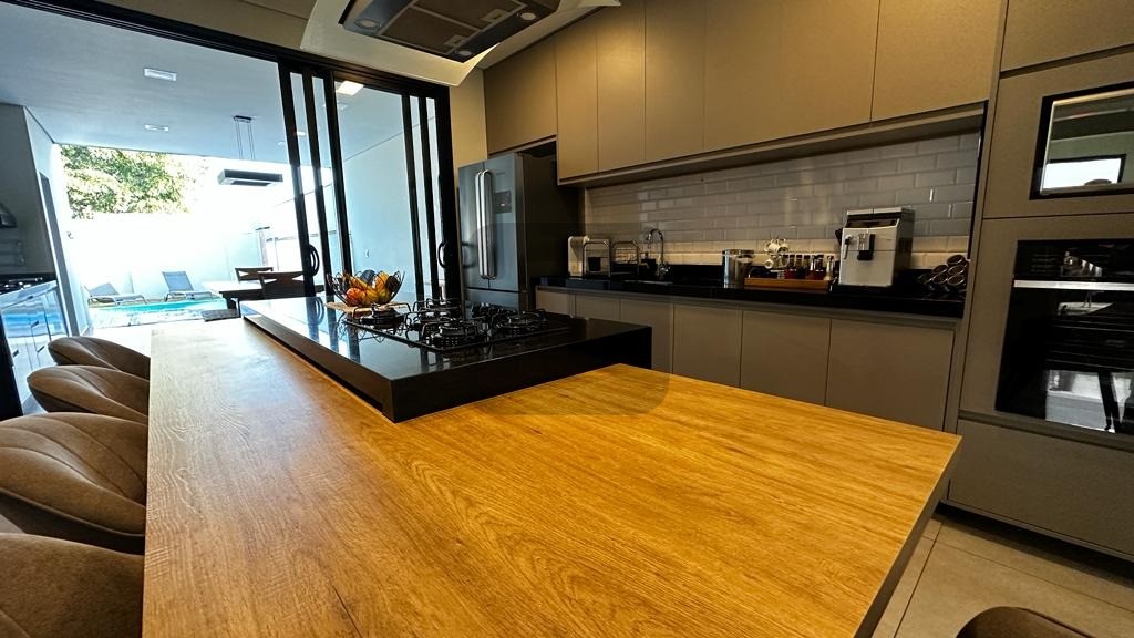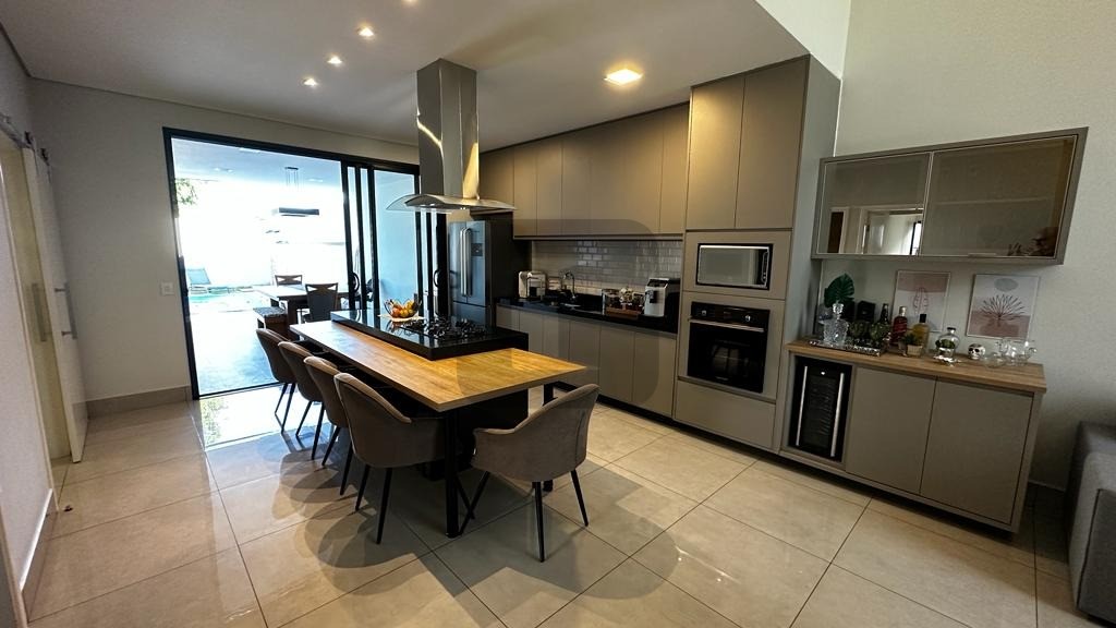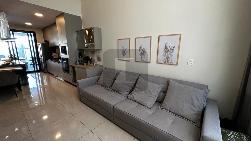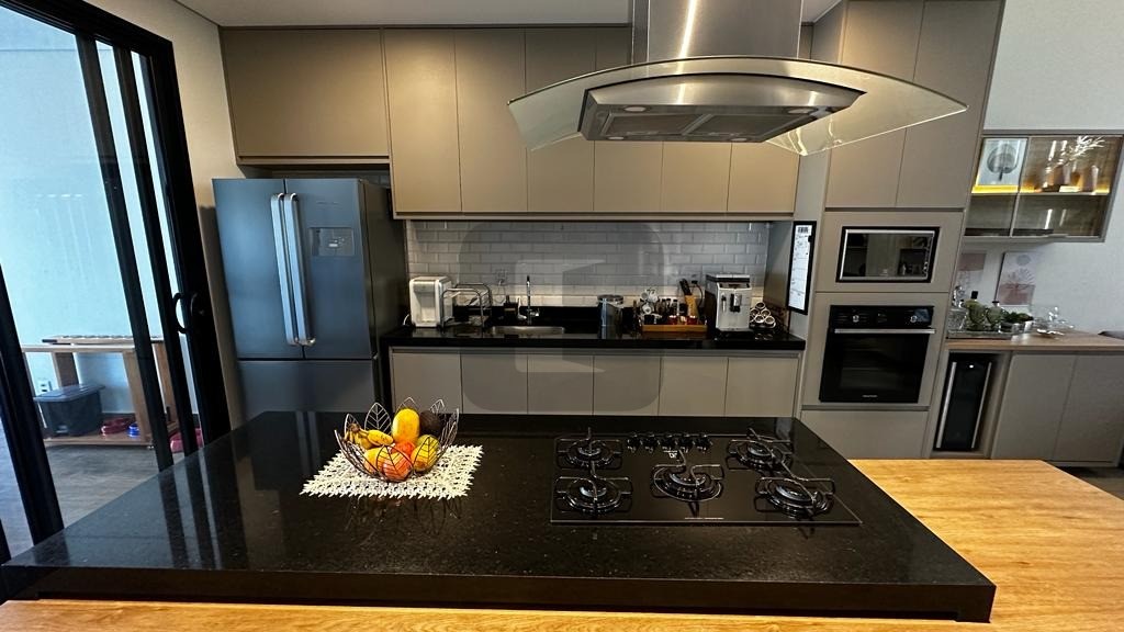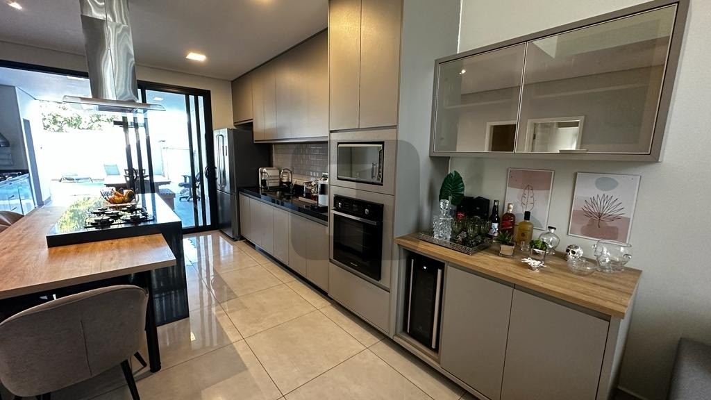 O living possui pé direito duplo, é integrado à ampla cozinha que possui uma belíssima ilha com eletrodomésticos de 1ª linha instalados.