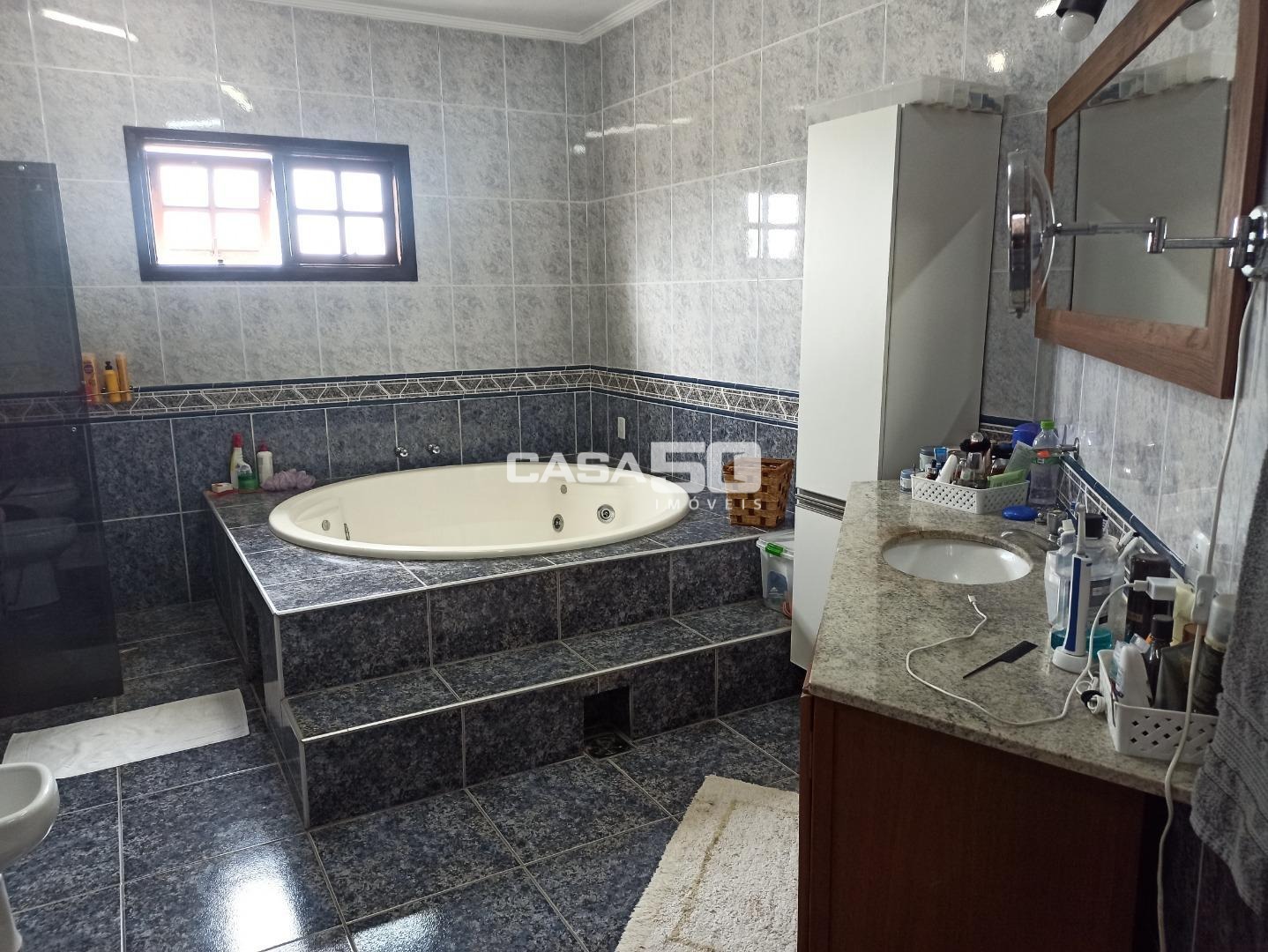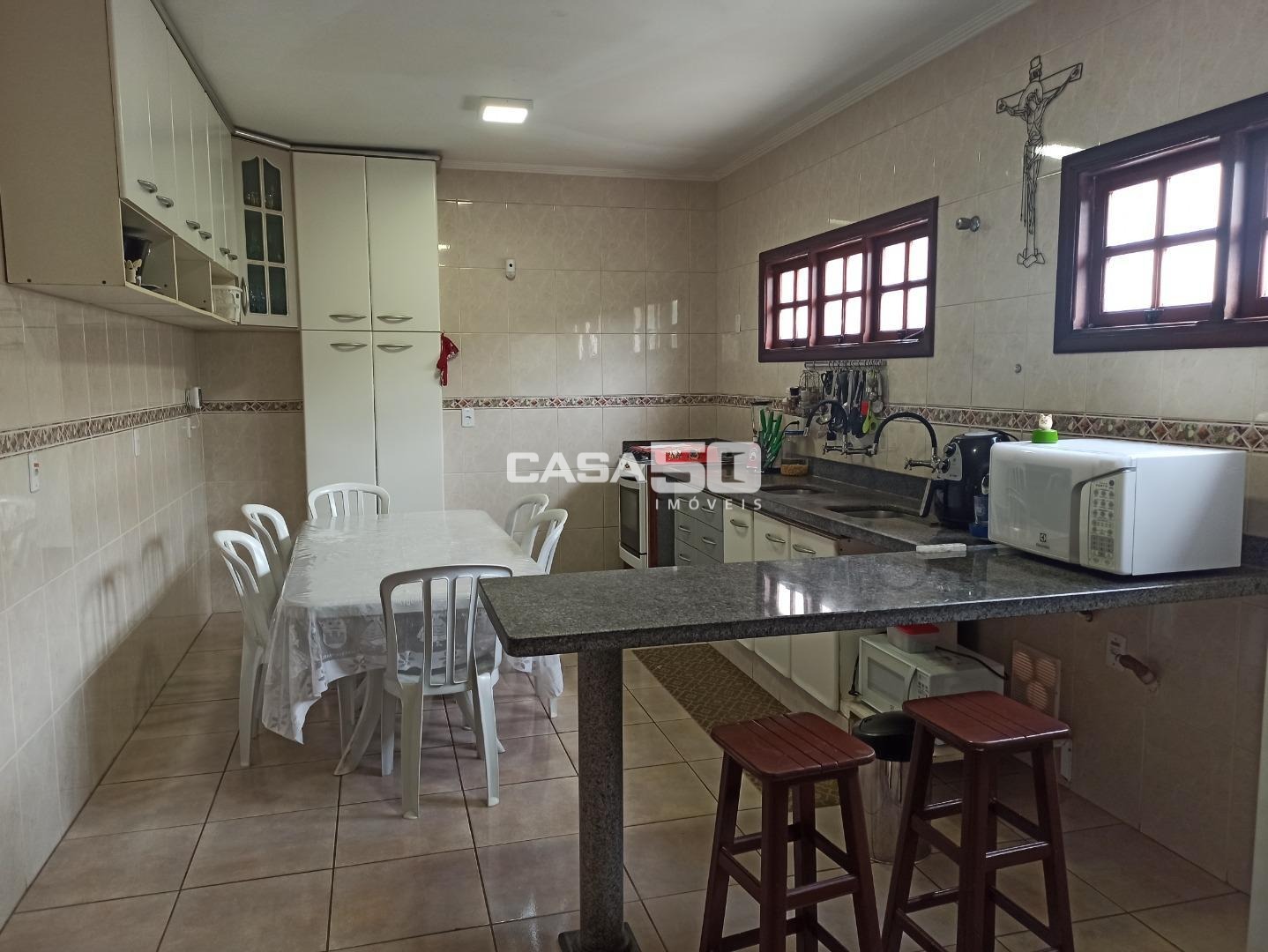O piso inferior conta com uma ampla sala para três ambientes, sala privativa de TV, escritório, lavabo, cozinha espaçosa com pia de cuba dupla e água quente, lavanderia, despensa e banheiro empregados. No piso superior, você encontrará 5 quartos, incluindo 2 suítes, uma delas suíte master com closet e hidromassagem, e um banheiro social. Todos os quartos têm acesso a uma ampla sacada com vista para a piscina.