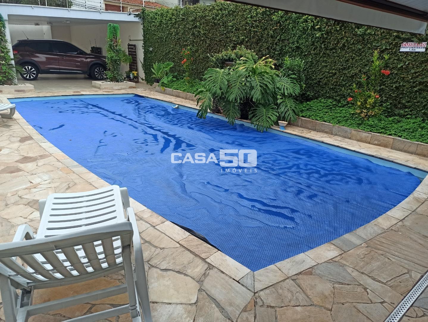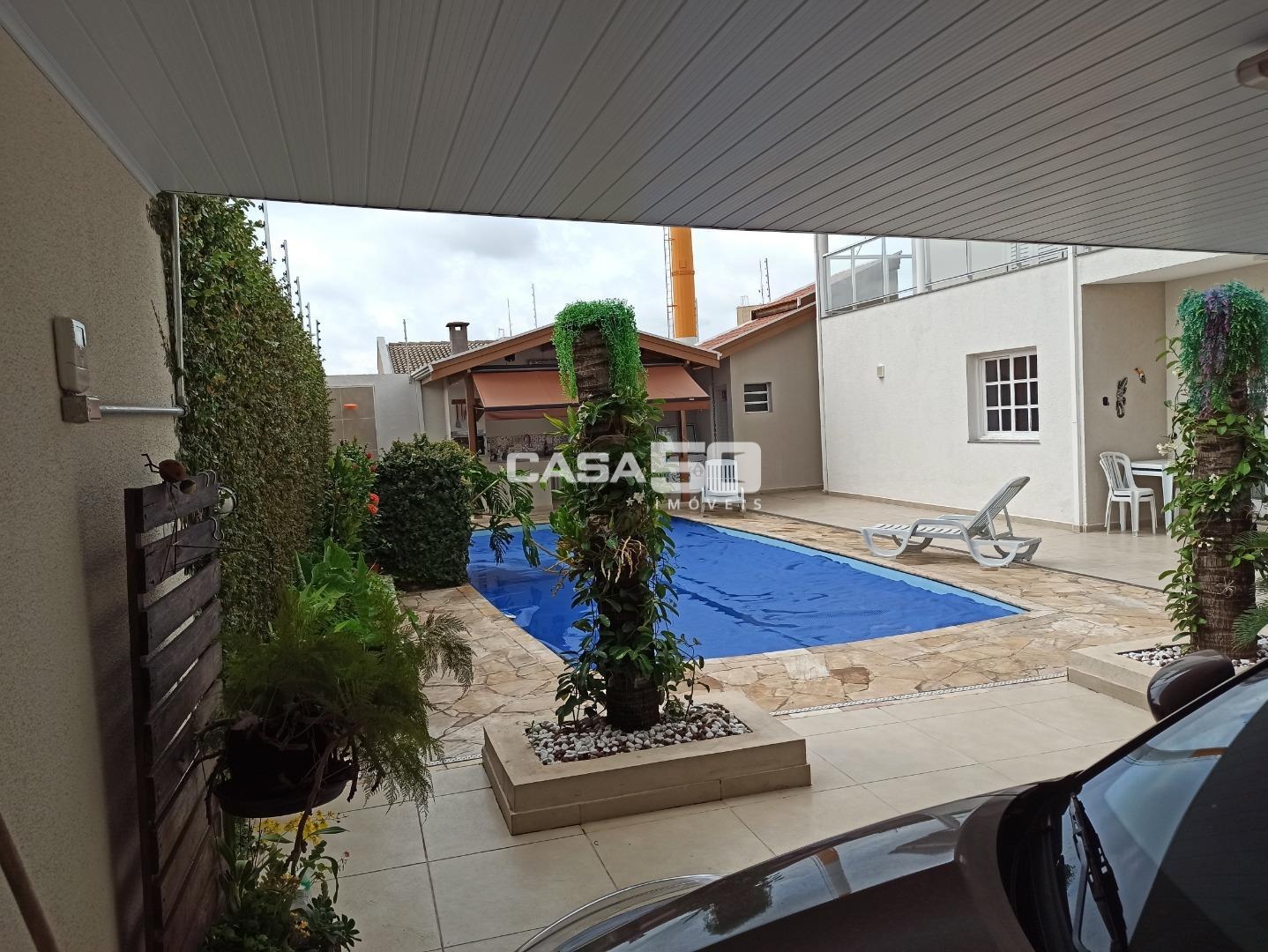 A área de lazer é um destaque, com churrasqueira, ducha, dois banheiros, pergolado para plantas e piscina com cascata. Toda a área externa é revestida com porcelanato, garantindo um acabamento de alta qualidade. A garagem coberta acomoda 3 carros, com mais 5 vagas descobertas.