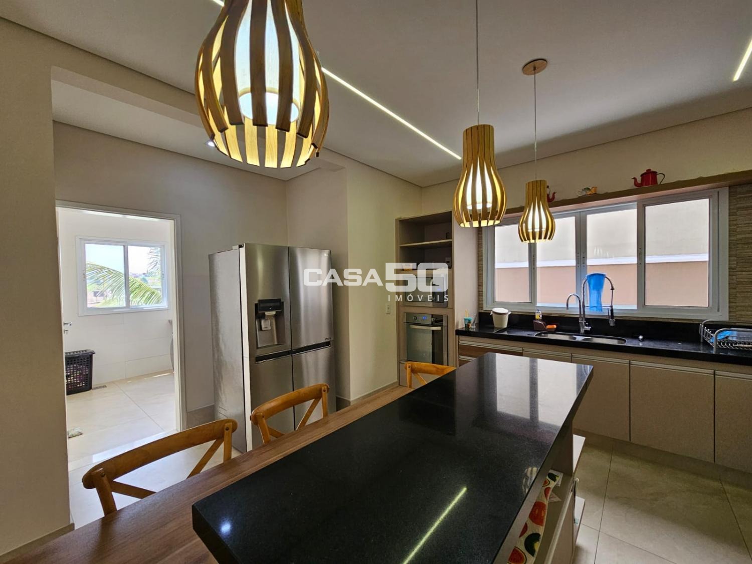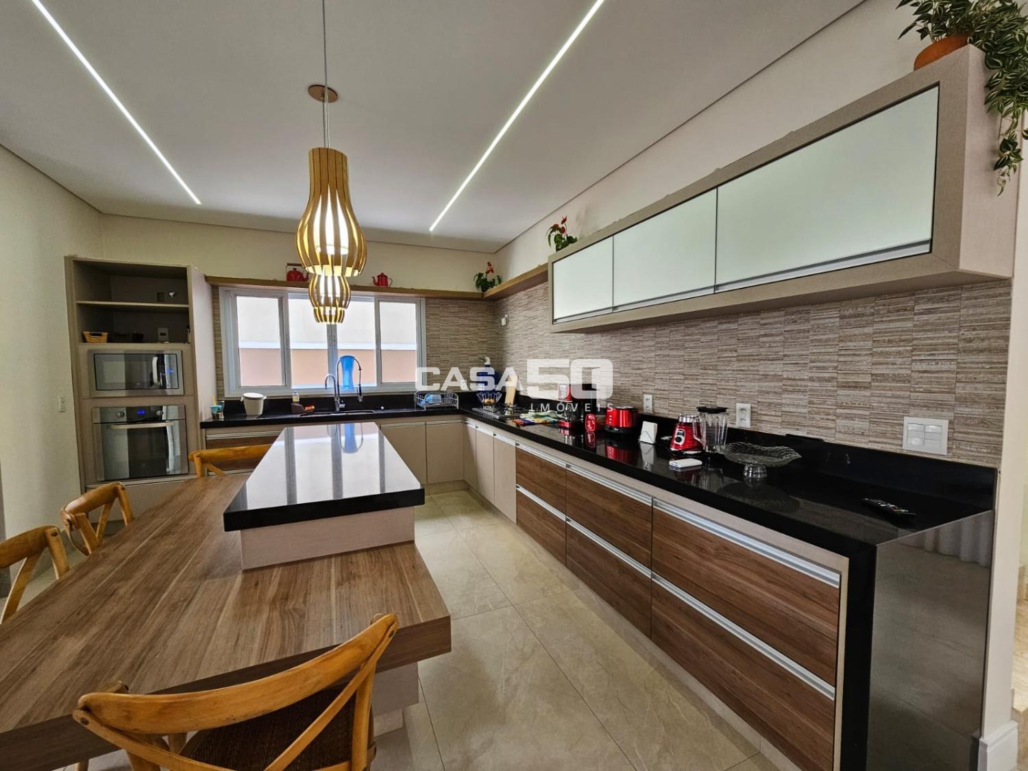 Sala de estar, Sala de Jantar com pé direito duplo e Cozinha com ilha completa integrados.