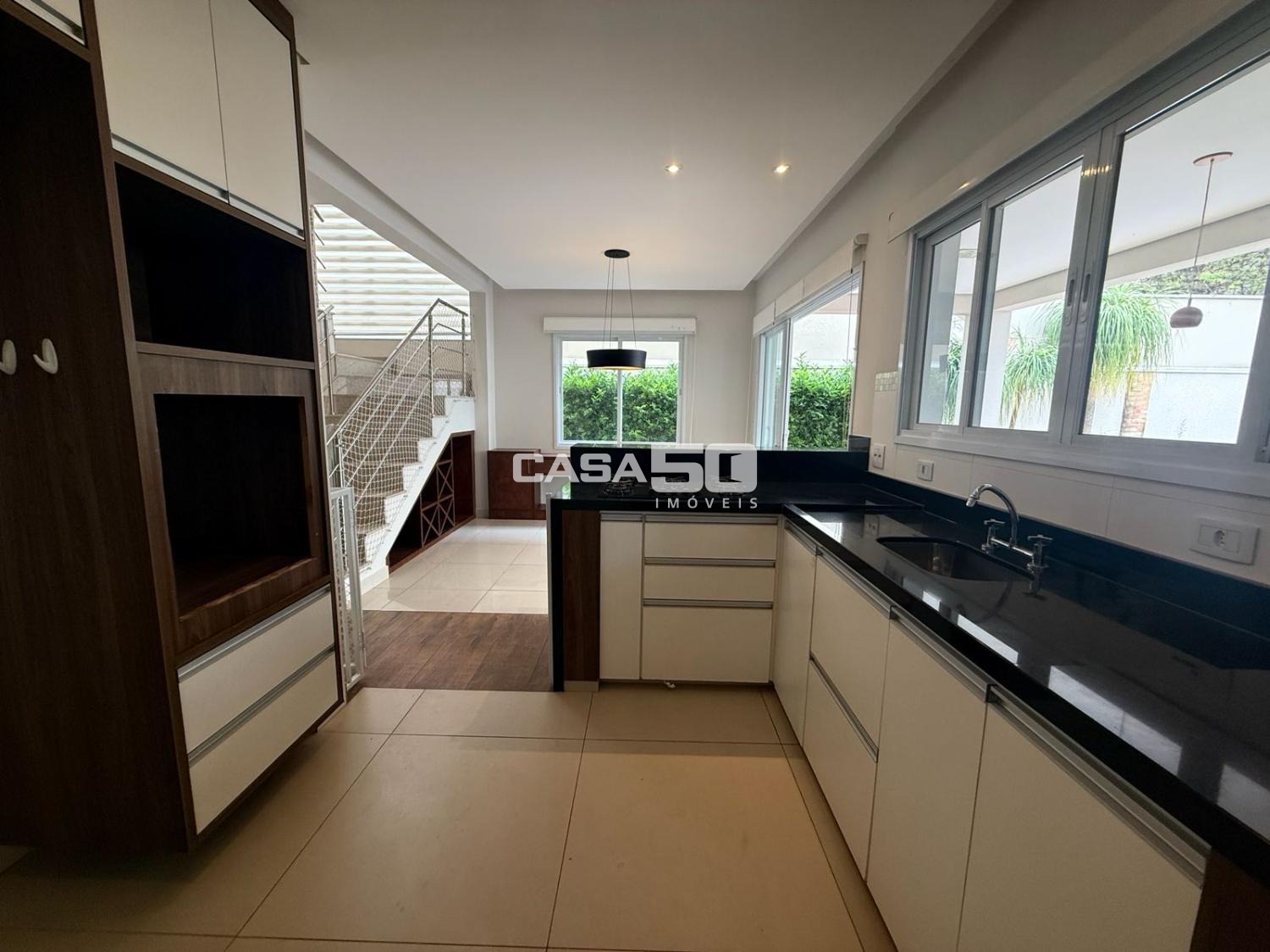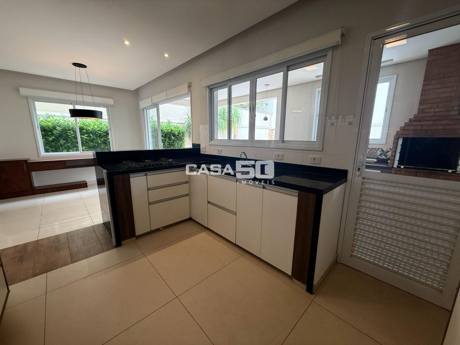 A área social é espaçosa e integrada, composta por sala de estar com lareira a lenha, sala de jantar e escritório, além de lavabo para atender as visitas. A cozinha é funcional e bem planejada, com despensa separada e lavanderia independente.